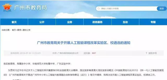 广州市教育局公布《广州市教育局关于开展人工智能改革试验区、校遴选的通知》,表明将于本年秋季开展人工智能校本课程试点实验,到2022年,实现人工智能教育覆盖广州全市学校。